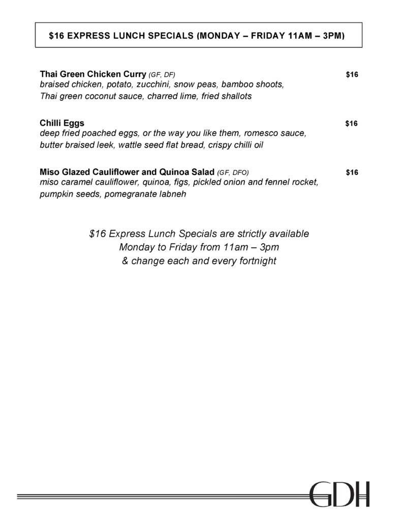 $16 Express Lunch selections available Monday to Friday 11am – 3pm
